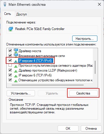 5. В открывшемся окне выбираем Интернет протокол версии 4 (TCP/IPv4) и нажимаем кнопку Свойства